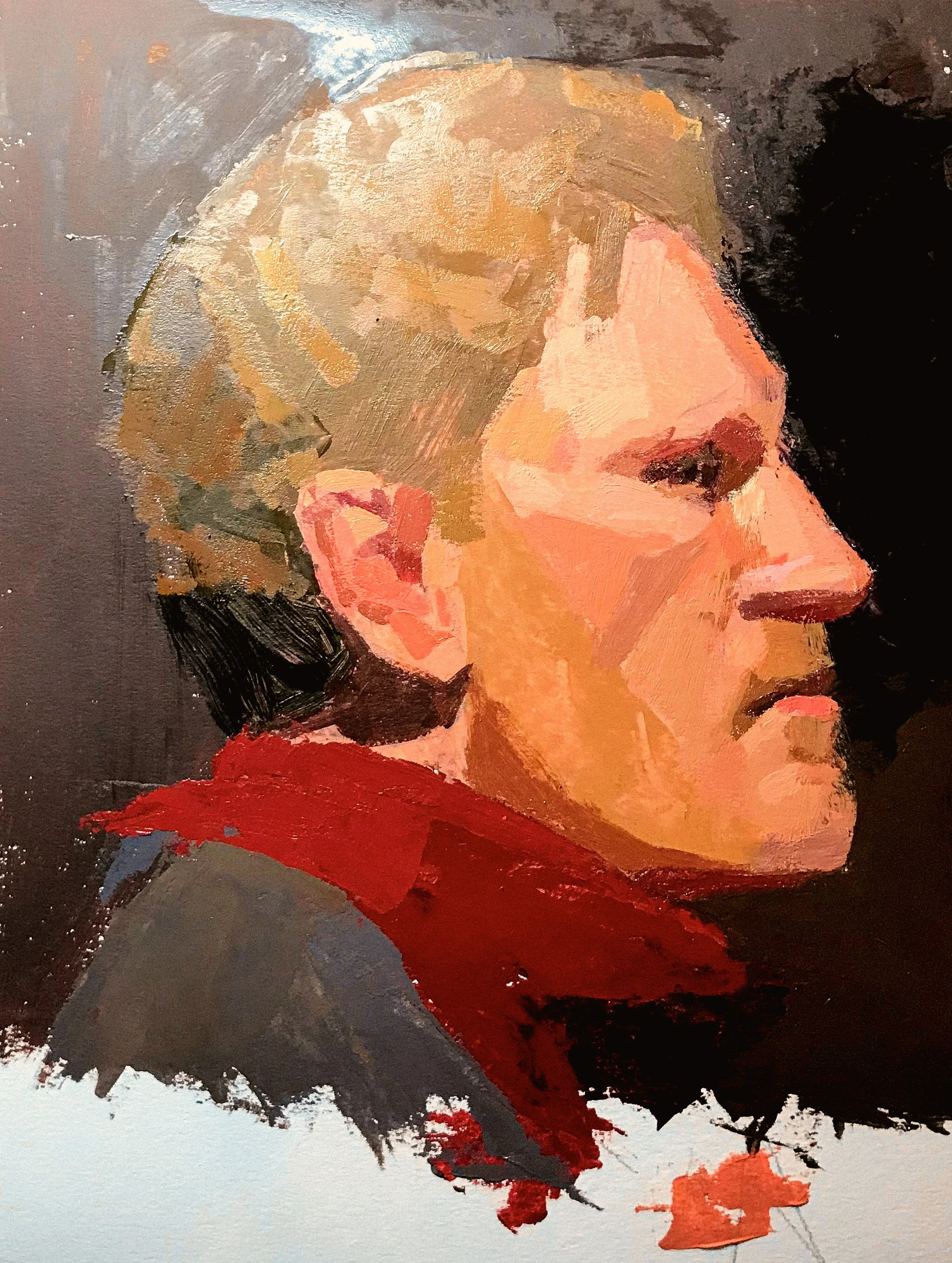 I modeled in an open studio portrait drawing and painting three hour session Wednesday night at Gage Academy of Art, North Capitol Hill, Seattle. I’ve been attending the workshop for two months developing observational drawing skills attempting to capture a realistic likeness while infusing a sense of self-expression into the sitter’s gaze. The class is free but you’re eventually called to model clothed among the dozen or more artists. I was asked and I took the seat on the raised platform enjoying the experience as my body remained still with deep breathing while my mind was free to wander. After a twenty minute timer, I would get up and rest five minutes repeating the process nine times. The five artists who drew and painted my likeness were each impressively unique bringing their own interpretive skill to the easel.